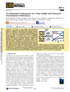 Tippireddy, S., Azough, F., Vikram, V., Towers Tompkins, F., Bhui, A., Freer, R., Grau-Crespo, R. ORCID: https://orcid.org/0000-0001-8845-1719, Biswas, K., Vaqueiro, P. ORCID: https://orcid.org/0000-0001-7545-6262 and Powell, A. V. (2022) Tin-substituted chalcopyrite: an n-type sulfide with enhanced thermoelectric performance. Chemistry of Materials, 34 (13). pp. 5860-5873. ISSN 1520-5002 doi: 10.1021/acs.chemmater.2c00637