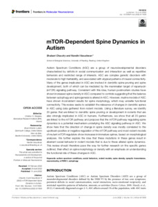 Autism Spectrum Conditions (ASC) are a group of neurodevelopmental disorders characterized by deficits in social communication and interaction as well as repetitive behaviors and restricted range of interests. ASC are complex genetic disorders with moderate to high heritability, and associated with atypical patterns of neural connectivity. Many of the genes implicated in ASC are involved in dendritic spine pruning and spine development, both of which can be mediated by the mammalian target of rapamycin (mTOR) signaling pathway. Consistent with this idea, human postmortem studies have shown increased spine density in ASC compared to controls suggesting that the balance between autophagy and spinogenesis is altered in ASC. However, murine models of ASC have shown inconsistent results for spine morphology, which may underlie functional connectivity. This review seeks to establish the relevance of changes in dendritic spines in ASC using data gathered from rodent models. Using a literature survey, we identify 20 genes that are linked to dendritic spine pruning or development in rodents that are also strongly implicated in ASC in humans. Furthermore, we show that all 20 genes are linked to the mTOR pathway and propose that the mTOR pathway regulating spine dynamics is a potential mechanism underlying the ASC signaling pathway in ASC. We show here that the direction of change in spine density was mostly correlated to the upstream positive or negative regulation of the mTOR pathway and most rodent models of mutant mTOR regulators show increases in immature spines, based on morphological analyses. We further explore the idea that these mutations in these genes result in aberrant social behavior in rodent models that is due to these altered spine dynamics. This review should therefore pave the way for further research on the specific genes outlined, their effect on spine morphology or density with an emphasis on understanding the functional role of these changes in ASC.