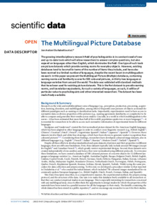 Duñabeitia, J. A., Baciero, A., Antoniou, K., Antoniou, M., Ataman, E., Baus, C., Ben-Shachar, M., Çağlar, O. C., Chromý, J., Comesaña, M., Filip, M., Filipović Đurđević, D., Gillon Dowens, M., Hatzidaki, A., Januška, J., Jusoh, Z., Kanj, R., Kim, S. Y., Kırkıcı, B., Leminen, A., Lohndal, T., Yap, N. T., Renvall, H., Rothman, J., Royle, P., Santesteban, M., Sevilla, Y., Slioussar, N., Vaughan-Evans, A., Wodniecka, Z., Wulff, S. and Pliatsikas, C. ORCID: https://orcid.org/0000-0001-7093-1773 (2022) The multilingual picture database. Scientific Data, 9. 431. ISSN 2052-4463 doi: 10.1038/s41597-022-01552-7