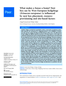 Gazzard, A. and Baker, P. J. (2022) What makes a house a home? Nest box use by West European hedgehogs (Erinaceus europaeus) is influenced by nest box placement, resource provisioning and site-based factors. PeerJ, 10. e13662. ISSN 2167-8359 doi: 10.7717/peerj.13662