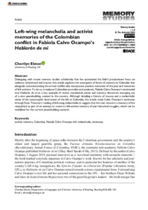 Dialoguing with recent memory studies scholarship that has questioned the field’s predominant focus on violence, victimhood and trauma, this article explores the emergence of forms of memory in Colombia that alongside commemorating the armed conflict also incorporate positive memories of the past and memories of left-activism. To do so, it analyses Colombian journalist and academic, Fabiola Calvo Ocampo’s testimonial text Hablarán de mí as a key example of recent transitional justice and memory discourses emerging out of a new peacebuilding context in the country. Although detailing a history of trauma and a melancholic vision of the catastrophic destruction of the left in Colombia, the article reads Calvo Ocampo’s testimony through Enzo Traverso’s reading of left-wing melancholia to suggest that the text recovers a memory of the vanquished as part of attempt to restore a left-activist memory of past historical struggles, which can be mobilised for the current peacebuilding scenario.