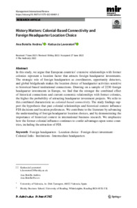 In this study, we argue that European countries’ extensive relationships with former colonies represent a location factor that attracts foreign headquarter investments. The strategic role of foreign headquarters as coordinators, opportunity detectors, and global bridgeheads makes the location choice of headquarter activities sensitive to historical-based institutional connections. Drawing on a sample of 2,230 foreign headquarter investments in Europe, we find that the stronger the combined effect of historical connections and current economic relationships with former colonies, the higher the probability of attracting headquarter investment projects. We refer to this combined characteristic as colonial-based connectivity. The study findings support the hypothesis that past colonial relationships and historical context influence FDI decisions and location preferences. We contribute to the literature by advancing the understanding of foreign headquarter location choices, and by demonstrating the importance of historical context in international business research. We emphasize how the former colonial influence continues to confer advantages upon some countries, including the attraction of FDI.