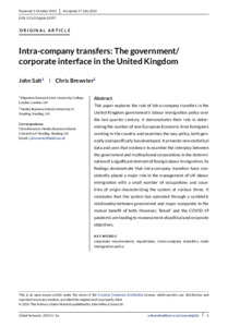 Salt, J. and Brewster, C. ORCID: https://orcid.org/0000-0001-5314-1518 (2023) Intra-company transfers: the government/corporate interface in the UK. Global Networks-a Journal of Transnational Affairs, 23 (2). pp. 375-390. ISSN 1470-2266 doi: 10.1111/glob.12397
