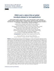 Muñoz-Sabater, J. ORCID: https://orcid.org/0000-0002-5997-290X, Dutra, E., Agustí-Panareda, A., Albergel, C. ORCID: https://orcid.org/0000-0003-1095-2702, Arduini, G., Balsamo, G. ORCID: https://orcid.org/0000-0002-1745-3634, Boussetta, S. ORCID: https://orcid.org/0000-0001-8646-8701, Choulga, M., Harrigan, S. ORCID: https://orcid.org/0000-0002-0992-3667, Hersbach, H. ORCID: https://orcid.org/0000-0001-5330-7071, Martens, B. ORCID: https://orcid.org/0000-0002-7368-7953, Miralles, D. G. ORCID: https://orcid.org/0000-0001-6186-5751, Piles, M. ORCID: https://orcid.org/0000-0002-1169-3098, Rodríguez-Fernández, N. J. ORCID: https://orcid.org/0000-0003-3796-149X, Zsoter, E. ORCID: https://orcid.org/0000-0002-7998-0130, Buontempo, C. ORCID: https://orcid.org/0000-0002-1874-5380 and Thépaut, J.-N. (2021) ERA5-Land: a state-of-the-art global reanalysis dataset for land applications. Earth System Science Data, 13 (9). pp. 4349-4383. ISSN 1866-3516 doi: 10.5194/essd-13-4349-2021