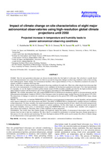 Haslebacher, C., Demory, M.-E., Demory, B.-O., Sarazin, M. and Vidale, P. L. ORCID: https://orcid.org/0000-0002-1800-8460 (2022) Impact of climate change on site characteristics of eight major astronomical observatories using high-resolution global climate projections until 2050. Astronomy & Astrophysics, 665. A149. ISSN 1432-0746 doi: 10.1051/0004-6361/202142493