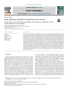 Early warning systems (EWS) for river flooding are strategic tools for effective disaster risk management in many world regions. When driven by ensemble Numerical Weather Predictions (NWP), flood EWS can provide skillful streamflow forecasts beyond the monthly time scale in large river basins. Yet, effective flood detection is challenged by accurate estimation of warning thresholds that identify specific hazard levels along the entire river network and forecast horizon. This research describes a novel approach to estimate warning thresholds which retain statistical consistency with the operational forecasts at all lead times. The procedure is developed in the context of the Global Flood Awareness System (GloFAS). A 21-year forecast-consistent dataset is used to derive thresholds with global coverage and forecast range up to six weeks. These are compared with thresholds derived from ERA5, a state of the art atmospheric reanalysis used to run the baseline simulation for the years 1986–2017 and to give a best guess of the present hydrological states. Findings show that the use of constant thresholds for 30-day flood forecasting, as in the current operational GloFAS setup, is consistent throughout the entire forecast range in only 30% to 40% of the river network, depending on the flood return period. Findings show that range-dependent thresholds, of weekly duration, are a more suitable alternative to time-invariant thresholds, as they improve the model consistency as well as the skills in flood monitoring and early warning, particularly over longer forecasting range.