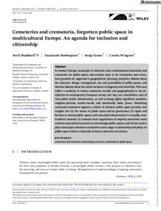 In western Europe, municipal or otherwise state‐commissioned cemeteries and crematoria are public spaces and services, open to all. Cemeteries and crematoria grounds are neglected in geographical, planning and policy debates about the character, design, management, use and accessibility of public spaces, and likewise debates about the social inclusion of migrants and minorities. This may reflect a tendency to situate cemeteries socially and geographically in the peripheries of contemporary European society, but they are, nonetheless, sites of vital public health infrastructure, as well as being highly significant symbolic, religious‐spiritual, secular‐sacred, and emotionally laden places. Examining cemeteries‐crematoria against a criteria of inclusive public space provides new insights into (1) the nature of public space and its governance; (2) rights and barriers to shared public spaces and associated infrastructure in everyday multicultural contexts; (3) national–local negotiations of majority‐minorities social relations and cultural practices in and through public spaces; and (4) the need to place municipal cemeteries‐crematoria centre stage in scholarship and policy on public space which is culturally inclusive and serves all citizens.