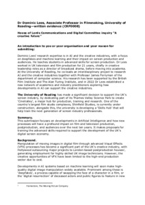 This submission focuses on developments in Artificial Intelligence and how new processes will have a profound impact on film and television production, postproduction, and audiences over the next ten years. It makes proposals for training the advanced skills required to support the development of the UK’s digital screen economy.