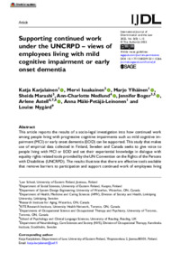 This article reports the results of a socio-legal investigation into how continued work among people living with progressive cognitive impairments such as mild cognitive im- pairment (MCI) or early onset dementia (EOD) can be supported. This study that makes use of empirical data collected in Finland, Sweden and Canada seeks to give voice to people living with MCI or EOD and set their experiential knowledge in dialogue with equality rights related tools provided by the UN Convention on the Rights of the Persons with Disabilities (UNCRPD). The results illustrate that there are effective tools available that remove barriers to participation and support continued work of employees living with cognitive impairments at least for some time while impairments are mild. Ideally, flexibility and solidarity in the workplace automatically eliminates the effects of individual impairment. However, cognitive impairments are often such that along with general accessibility measures individual accommodations are needed. Supporting continued work expands the freedom to continue meaningful work in the preferred manner and offers people the means to gain a livelihood and participate in society as a member of the work community on equal basis with others.