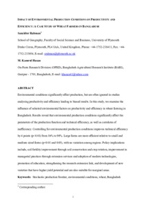 Environmental conditions significantly affect production, but are often ignored in studies analysing productivity and efficiency leading to biased results. In this study, we examine the influence of selected environmental factors on productivity and efficiency in wheat farming in Bangladesh. Results reveal that environmental production conditions significantly affect the parameters of the production function and technical efficiency, as well as correlates of inefficiency. Controlling for environmental production conditions improves technical efficiency by 4 points (p<0.01) from 86% to 90%. Large farms are more efficient relative to small and medium sized farms (p<0.01 and 0.05), with no variation among regions. Policy implications include soil fertility improvement through soil conservation and crop rotation, improvement in managerial practices through extension services and adoption of modern technologies, promotion of education, strengthening the research-extension link, and development of new varieties that have higher yield potential and are also suitable for marginal areas.
