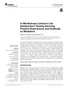 Grounded in Mindfulness-to-Meaning Theory, this study examined the relation between dispositional mindfulness and life satisfaction through mediating mechanisms including savoring positive experiences and gratitude. A total of 133 Chinese mindfulness practitioners at 20–72 years old were recruited from a 3-day transnational meditation event in Hong Kong. Findings based on structural equation modeling indicated that controlling for sex, age, education, family income, number of hours of mindfulness practice per week, and type of administration, dispositional mindfulness was associated with satisfaction with life through savoring positive experiences and gratitude as mediators. The findings provided initial evidence for these processes between mindfulness and life satisfaction in the Chinese context. To promote life satisfaction, researchers and mental health practitioners should recognize the chain of mechanisms related to mindfulness.
