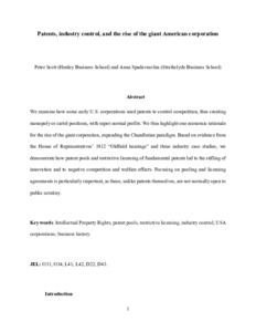 We examine how some early U.S. corporations used patents to control competition, thus creating monopoly or cartel positions, with super-normal profits. We thus highlight one economic rationale for the rise of the giant corporation, expanding the Chandlerian paradigm. Based on evidence from the House of Representatives’ 1912 “Oldfield hearings” and three industry case studies, we demonstrate how patent pools and restrictive licensing of fundamental patents led to the stifling of innovation and to negative competition and welfare effects. Focusing on pooling and licensing agreements is particularly important, as these, unlike patents themselves, are not normally open to public scrutiny.