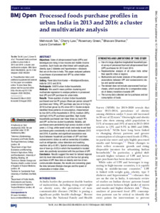 Objectives Sales of ultraprocessed foods (UPFs) and beverages are rising in low-income and middle-income countries. Such foods are often linked with weight gain, obesity, type 2 diabetes and hypertension—diseases that are on the rise in India. This paper analysed patterns in purchases of processed and UPF by urban Indian households. Setting Panel data from Kantar —Worldpanel Division, India for 2013 and 2016. Participants 58 878 urban Indian households. Methods We used K-mean partition clustering and multivariate regression to analyse patterns in processed food (PF) and UPF purchase for urban India. Results Three-quarters of urban Indian households purchased over ten PF groups. Mean per person annual PF purchase was 150 kg. UPF purchase was low at 6.4 kg in 2016 but had grown by 6% since 2013. Cluster analysis identified three patterns of consumption, characterised by low (54% of the households in 2016), medium (36%) and high (10%) PF purchase quantities. High cluster households purchased over three times as much PFs and UPF as the low cluster households. Notably, salt purchases were persistently high across clusters in both years (>3.3 kg), while sweet snack and ready-to- eat food purchases grew consistently in all clusters between 2013 and 2016. A positive and significant association was found between household purchases of UPF and their socioeconomic status as well as ownership of durables, such as refrigerator, colour television and washing machine (all p<0.001). Spatial characteristics including size of town (p<0.05) in which the household is located were also positively associated with the purchase of UPF. Conclusion Results suggest the need for tailored regional and city level interventions to curb the low but growing purchase of UPF. New data on obesity and rise of non-communicable diseases, the results are concerning given the links between lifestyle changes and the speed of urbanisation in Indian cities.