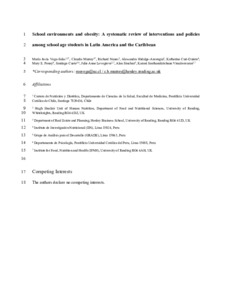 BACKGROUND: The rapid rise in obesity rates among school children in Latin America and the Caribbean (LAC) could have a direct impact on the region’s physical and mental health, disability, and mortality. This review presents the available interventions likely to reduce, mitigate and/or prevent obesity among school children in LAC by modifying the food and built environments within and around schools. METHODS: Two independent reviewers searched five databases: MEDLINE, Web of Science, Cochrane Library, Scopus and Latin American and Caribbean Health Sciences Literature for peer-reviewed literature published from 1 January 2000 to September 2021; searching and screening prospective studies published in English, Spanish and Portuguese. This was followed by data extraction and quality assessment using the Cochrane risk-of-bias tool (RoB 2) and the Risk of Bias in Non-Randomized Studies of Interventions (ROBINS-I), adopting also the PRISMA 2020 guidelines. Due to the heterogeneity of the intervention’s characteristics and obesityrelated measurements across studies, a narrative synthesis was conducted. RESULTS: A total of 1342 research papers were screened, and 9 studies were included; 4 in Mexico, and 1 each in Argentina, Brazil, Chile, Colombia, and Ecuador. Four studies reported strategies for modifying food provision; four other targeted the built environment, (modifying school premises and providing materials for physical activity); a final study included both food and built environment intervention components. Overall, two studies reported that the intervention was significantly associated with a lower increase over time in BMI/obesity in the intervention against the control group. The remaining studies were non-significant. CONCLUSIONS: Data suggest that school environmental interventions, complementing nutritional and physical education can contribute to reduce incremental childhood obesity trends. However, evidence of the extent to which food and built environment components factor into obesogenic environments, within and around school grounds is inconclusive. Insufficient data hindered any urban/rural comparisons. Further school environmental intervention studies to inform policies for preventing/reducing childhood obesity in LAC are needed.