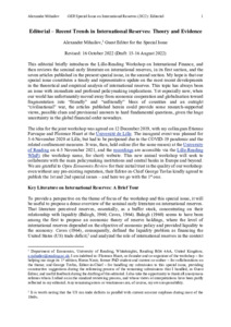 This editorial briefly introduces the Lille-Reading Workshop on International Finance, and then reviews the seminal early literature on international reserves, in its first section, and the seven articles published in the present special issue, in the second section. My hope is that our special issue constitutes a timely and representative update on the most recent developments in the theoretical and empirical analysis of international reserves. This topic has always been an issue with immediate and profound policymaking implications. Yet especially now, when our world has unfortunately moved away from economic cooperation and globalisation toward fragmentation into “friendly” and “unfriendly” blocs of countries and an outright “civilisational” war, the articles published herein could provide some research-supported views, possible clues and provisional answers to hard fundamental questions, given the huge uncertainty in the global financial order nowadays.