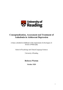 Watson, R. (2021) Conceptualisation, assessment and treatment of Anhedonia in adolescent depression. PhD thesis, University of Reading. doi: 10.48683/1926.00108429