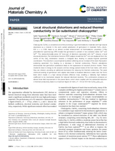 Tippireddy, S., azough, F., Vikram, V., Bhui, A., Chater, P., Kepaptsoglou, D., Ramasse, Q., Freer, R., Grau-Crespo, R. ORCID: https://orcid.org/0000-0001-8845-1719, Biswas, K., Vaqueiro, P. ORCID: https://orcid.org/0000-0001-7545-6262 and Powell, A. V. (2022) Local structural distortions and reduced thermal conductivity in Ge-Substituted Chalcopyrite. Journal of Materials Chemistry A, 10 (44). pp. 23874-23885. ISSN 0959-9428 doi: 10.1039/D2TA06443J