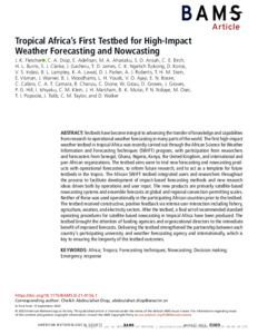 Fletcher, J. K., Diop, C. A., Adefisan, E., Ahiataku, M. A., Ansah, S. O., Birch, C. E., Burns, H. L., Clarke, S. J., Gacheru, J., James, T. D., Ngetich Tuikong, C. K., Koros, D., Indasi, V. S., Lamptey, B. L., Lawal, K. A., Parker, D. J., Roberts, A. J., Stein, T. H. M. ORCID: https://orcid.org/0000-0002-9215-5397, Visman, E., Warner, J., Woodhams, B. J., Youds, L. H., Ajayi, V. O., Bosire, E. N., Cafaro, C. ORCID: https://orcid.org/0000-0001-8063-4887, Camara, C. A. T., Chanzu, B., Dione, C., Gitau, W., Groves, D., Groves, J., Hill, P. G. ORCID: https://orcid.org/0000-0002-9745-2120, Ishiyaku, I., Klein, C. M., Marsham, J. H., Mutai, B. K., Ndiaye, P. N., Osei, M., Popoola, T. I., Talib, J., Taylor, C. M. and Walker, D. (2023) Tropical Africa’s first testbed for high-impact weather forecasting and nowcasting. Bulletin of the American Meteorological Society, 104 (8). E1409-E1425. ISSN 1520-0477 doi: 10.1175/bams-d-21-0156.1
