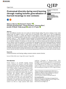 Norman, R. ORCID: https://orcid.org/0000-0002-4272-4352, Hulme, R. C. ORCID: https://orcid.org/0000-0002-9596-7729, Sarantopoulos, C., Chandran, V., Shen, H., Rodd, J. M., Joseph, H. ORCID: https://orcid.org/0000-0003-4325-4628 and Taylor, J. S. H. ORCID: https://orcid.org/0000-0002-1109-8539 (2023) Contextual diversity during word learning through reading benefits generalisation of learned meanings to new contexts. Quarterly Journal of Experimental Psychology, 76 (7). pp. 1658-1671. ISSN 1747-0218 doi: 10.1177/17470218221126976