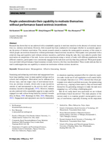Kuratomi, K., Johnsen, L., Kitagami, S., Hatano, A. and Murayama, K. (2023) People underestimate their capability to motivate themselves without performance-based extrinsic incentives. Motivation and Emotion, 47. pp. 509-523. ISSN 1573-6644 doi: 10.1007/s11031-022-09996-5