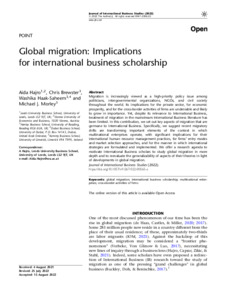 Migration is increasingly viewed as a high-priority policy issue among politicians, intergovernmental organizations, NGOs, and civil society throughout the world. Its implications for the private sector, for economic prosperity, and for the cross-border activities of firms are undeniable and likely to grow in importance. Yet, despite its relevance to International Business, treatment of migration in the mainstream International Business literature has been limited. In this contribution, we set out key aspects of migration that are germane to International Business. Specifically, we suggest recent migratory shifts are transforming important elements of the context in which multinational enterprises operate, with significant implications for their international human resource management practices, for firms’ entry modes and market selection approaches, and for the manner in which international strategies are formulated and implemented. We offer a research agenda to motivate International Business scholars to study global migration in more depth and to reevaluate the generalizability of aspects of their theories in light of developments in global migration.
