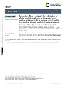 Keane, P. M. ORCID: https://orcid.org/0000-0003-2828-8512, Zehe, C. ORCID: https://orcid.org/0000-0002-3213-5669, Poynton, F. E., Bright, S. A., Estayalo-Adrián, S. ORCID: https://orcid.org/0000-0002-2896-7059, Devereux, S. J., Donaldson, P. M. ORCID: https://orcid.org/0000-0002-0305-9142, Sazanovich, I. V. ORCID: https://orcid.org/0000-0002-8000-7645, Towrie, M., Botchway, S. W., Cardin, C. J. ORCID: https://orcid.org/0000-0002-2556-9995, Williams, D. C., Gunnlaugsson, T. ORCID: https://orcid.org/0000-0003-4814-6853, Long, C. ORCID: https://orcid.org/0000-0002-9484-8744, Kelly, J. M. ORCID: https://orcid.org/0000-0002-3706-1777 and Quinn, S. J. ORCID: https://orcid.org/0000-0002-7773-8842 (2022) Time-resolved infra-red studies of photo-excited porphyrins in the presence of nucleic acids and in HeLa tumour cells: insights into binding site and electron transfer dynamics. Physical Chemistry Chemical Physics, 24 (44). pp. 27524-27531. ISSN 1463-9076 doi: 10.1039/d2cp04604k