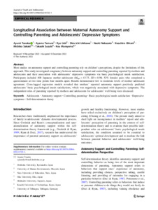 Tanaka, A., Tamura, A., Ishii, R., Ishikawa, S.-i., Nakazato, N., Ohtani, K., Sakaki, M. ORCID: https://orcid.org/0000-0003-1993-5765, Suzuki, T. and Murayama, K. (2023) Longitudinal association between maternal autonomy support and controlling parenting and adolescents’ depressive symptoms. Journal of Youth and Adolescence, 52. pp. 1058-1073. ISSN 1573-6601 doi: 10.1007/s10964-022-01722-1