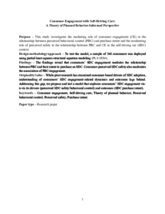 • Poo, B. and Dalziel, N. (2016), “Consumer perceptions towards radical innovation: Autonomous cars”, in British Academy of Management Conference Proceedings, available at: https://eprints.staffs.ac.uk/2487/1/Dalziel_Poo_BAM2016.pdf accessed 3 April 2022.