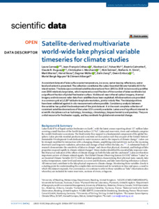 Carrea, L. ORCID: https://orcid.org/0000-0002-3280-2767, Cretaux, J.-F., Liu, X., Wu, Y., Calmettes, B., Duguay, C. R., Merchant, C. ORCID: https://orcid.org/0000-0003-4687-9850, Selmes, N., Simis, S. G. H., Warren, M., Yesou, H., Mueller, D., Jiang, D., Embury, O. ORCID: https://orcid.org/0000-0002-1661-7828, Berge-Nguyen, M. and Albergel, C. (2023) Satellite-derived multivariate world-wide lake physical variable timeseries for climate studies. Scientific Data, 10 (1). 30. ISSN 2052-4463 doi: 10.1038/s41597-022-01889-z