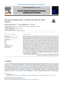 Numerous studies have examined Narrative Disclosure Tone (NDT) in different channels of financial reporting over the past decade. Our review of 64 studies aims to analyze tone measurements and areas of debate in NDT literature to suggest avenues for future research. First, we discuss previous studies that have compared tone measures based on alternative wordlists and shown that tone measures using domain-specific dictionaries are more powerful than those based on general dictionaries. However, future research should benefit from the advanced methods considering natural language processing mechanisms and the meanings rather than word frequency for more accuracy. Second, from the theoretical perspective, studies that linked psychological theories to the tone context are limited. Therefore, we call for more evidences from the upper echelons theory considering the interdependencies between executives. Finally, we critically review different directions of NDT studies and highlight areas for future research. Mainly, investigating the determinant of NDT requires a more comprehensive investigation considering top managers-specific characteristics, tax avoidance, audit quality, social capital and narrative regulatory settings. In addition, we call for more research about tone consistency among different channels of disclosures in companies’ communications with stakeholders.