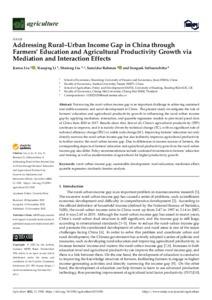 Liu, J. ORCID: https://orcid.org/0000-0002-2128-6015, Li, X., Liu, S., Rahman, S. ORCID: https://orcid.org/0000-0002-0391-6191 and Sriboonchitta, S. (2022) Addressing rural–urban income gap in China through farmers’ education and agricultural productivity growth via mediation and interaction effects. Agriculture, 12 (11). 1920. ISSN 2077-0472 doi: 10.3390/agriculture12111920