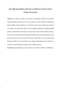 Cost stickiness, which is also termed cost asymmetry, describes the asymmetric relationship between revenue and cost. In this study, we examine whether high-speed railway (HSR) connection affects the cost stickiness of tourism firms. Employing a sample of 324 Chinese tourism firms from 2003 to 2018 and applying a difference-in-difference (DID) method, we find that the cost stickiness of tourism firms increases after HSR connection. Our results also reveal that the relationship between HSR connection and cost stickiness is more pronounced in firms with higher free cash flow (FCF), higher labor costs, and in state-owned enterprises (SOEs). Our research advances an indepth understanding of the cost behavior in tourism firms and sheds light on the policy effect of HSR connection.