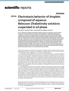 Taxis is ubiquitous in biological and physical chemistry systems as a response to various external stimulations. We prepared aqueous droplets containing Belousov-Zhabotinsky (BZ) solutions suspended on an oleic acid oil phase subject to DC electric field and found that these BZ droplets undergo chemically driven translational motion towards the negative electrode under DC electric field. This electrotaxis phenomenon originates from the field-induced inhomogeneous distribution of reactants, in particular Br− ions, and consequently the biased location of the leading centers towards the positive electrode. We define the ’Leading center’ (LC), where the BZ chemical wave (target pattern) is initiated within a whole droplet at a specific location within the droplet. The chemical wave generated from the LC propagates passing the droplet center of mass and creates a gradient of interfacial tension when reaching the droplet-oil interface on the other side, resulting in a momentum exchange between the droplet and oil phases which drives the droplet motion in the opposite direction of the electric field. A greater electric field strength renders a more substantial electrotaxis effect.