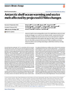 Cai, W., Jia, F., Li, S., Purich, A., Wang, G., Wu, L., Gan, B., Santoso, A., Geng, T., Ng, B., Yang, Y., Ferreira, D. ORCID: https://orcid.org/0000-0003-3243-9774, Meehl, G. A. and McPhaden, M. (2023) Antarctic shelf ocean warming and sea ice melt affected by projected El Niño changes. Nature Climate Change, 13. pp. 235-239. ISSN 1758-678X doi: 10.1038/s41558-023-01610-x
