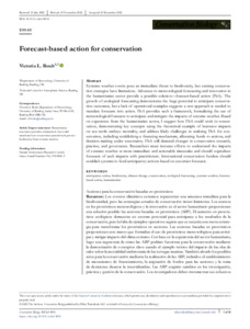 Extreme weather events pose an immediate threat to biodiversity, but existing conservation strategies have limitations. Advances in meteorological forecasting and innovation in the humanitarian sector provide a possible solution—forecast-based action (FbA). The growth of ecological forecasting demonstrates the huge potential to anticipate conservation outcomes, but a lack of operational examples suggests a new approach is needed to translate forecasts into action. FbA provides such a framework, formalizing the use of meteorological forecasts to anticipate and mitigate the impacts of extreme weather. Based on experience from the humanitarian sector, I suggest how FbA could work in conservation, demonstrating key concepts using the theoretical example of heatwave impacts on sea turtle embryo mortality, and address likely challenges in realizing FbA for conservation, including establishing a financing mechanism, allocating funds to actions, and decision-making under uncertainty. FbA will demand changes in conservation research, practice, and governance. Researchers must increase efforts to understand the impacts of extreme weather at more immediate and actionable timescales and should coproduce forecasts of such impacts with practitioners. International conservation funders should establish systems to fund anticipatory actions based on uncertain forecasts.