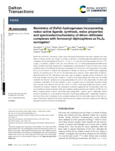 [FeFe]-Ase biomimics containing a redox-active ferrocenyl diphosphine have been prepared and their ability to reduce protons and oxidise H2 studied, including 1,1’-bis(diphenylphosphino)ferrocene (dppf) complexes Fe2(CO)4(μ-dppf)(μ-S(CH2)nS) (n = 2, edt; n = 3, pdt) and Fe2(CO)4(μ-dppf)(μ-SAr)2 (Ar = Ph, p-tolyl, p-C6H4NH2), together with the more electron-rich 1,1’-bis(dicyclohexylphosphino)ferrocene (dcpf) complex Fe2(CO)4(μ-dcpf)(μ-pdt). Crystallographic characterisation of four of these show similar overall structures, the diphosphine spanning an elongated Fe–Fe bond (ca. 2.6 Å), lying trans to one sulfur and cis to the second. In solution the diphosphine is flexible, as shown by VT NMR studies, suggesting that Fe2⋯Fe distances of ca. 4.5–4.7 Å in the solid state vary in solution. Cyclic voltammetry, IR spectroelectrochemistry and DFT calculations have been used to develop a detailed picture of electronic and structural changes occurring upon oxidation. In MeCN, Fe2(CO)4(μ-dppf)(μ-pdt) shows two chemically reversible one-electron oxidations occurring sequentially at Fe2 and Fc sites respectively. For other dppf complexes, reversibility of the first oxidation is poor, consistent with an irreversible structural change upon removal of an electron from the Fe2 centre. In CH2Cl2, Fe2(CO)4(μ-dcpf)(μ-pdt) shows a quasireversible first oxidation together with subsequent oxidations suggesting that the generated cation has some stability but slowly rearranges. Both pdt complexes readily protonate upon addition of HBF4·Et2O to afford bridging-hydride cations, [Fe2(CO)4(μ-H)(μ-dcpf)(μ-pdt)]+, species which catalytically reduce protons to generate H2. In the presence of pyridine, [Fe2(CO)4(μ-dppf)(μ-pdt)]2+ catalytically oxidises H2 but none of the other complexes do this, probably resulting from the irreversible nature of their first oxidation. Mechanistic details of both proton reduction and H2 oxidation have been studied by DFT allowing speculative reaction schemes to be developed.