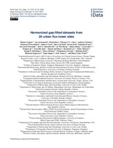 Lipson, M. ORCID: https://orcid.org/0000-0001-5322-1796, Grimmond, S. ORCID: https://orcid.org/0000-0002-3166-9415, Best, M., Chow, W. T. L., Christen, A., Chrysoulakis, N. ORCID: https://orcid.org/0000-0002-5208-626X, Coutts, A., Crawford, B., Earl, S., Evans, J. ORCID: https://orcid.org/0000-0003-4194-1416, Fortuniak, K. ORCID: https://orcid.org/0000-0001-7043-8751, Heusinkveld, B. G. ORCID: https://orcid.org/0000-0001-7844-8989, Hong, J.-W., Hong, J. ORCID: https://orcid.org/0000-0003-0139-602X, Järvi, L. ORCID: https://orcid.org/0000-0002-5224-3448, Jo, S., Kim, Y.-H., Kotthaus, S. ORCID: https://orcid.org/0000-0002-4051-0705, Lee, K. ORCID: https://orcid.org/0000-0003-4765-3474, Masson, V., McFadden, J. P., Michels, O., Pawlak, W., Roth, M., Sugawara, H., Tapper, N., Velasco, E. ORCID: https://orcid.org/0000-0002-1870-5565 and Ward, H. C. ORCID: https://orcid.org/0000-0001-8881-185X (2022) Harmonized gap-filled datasets from 20 urban flux tower sites. Earth System Science Data, 14 (11). pp. 5157-5178. ISSN 1866-3516 doi: 10.5194/essd-14-5157-2022