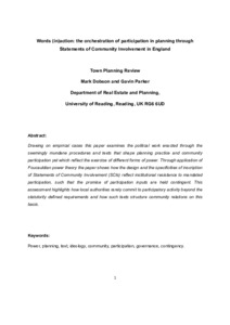 Dobson, M. ORCID: https://orcid.org/0000-0001-8599-9797 and Parker, G. ORCID: https://orcid.org/0000-0003-3079-4377 (2023) Words (in)action: the orchestration of participation in planning through Statements of Community Involvement in England. Town Planning Review. ISSN 1478-341X doi: 10.3828/tpr.2023.6