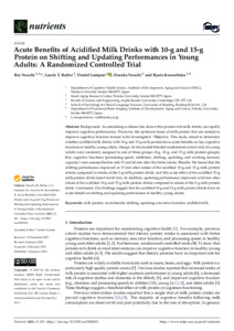 Background: Accumulating evidence has shown that protein-rich milk drinks can rapidly improve cognitive performance. However, the optimum doses of milk protein that are needed to improve cognitive function remain to be investigated. Objective: This study aimed to determine whether acidified milk drinks with 10-g and 15-g milk protein have acute benefits on key cognitive functions in healthy young adults. Design: In this double-blinded randomized control trial, 66 young adults were randomly assigned to one of three groups (0-g, 10-g, and 15-g milk protein groups). Key cognitive functions (processing speed, inhibition, shifting, updating, and working memory capacity) were assessed before and 15 and 60 min after the drink intake. Results: We found that the shifting performance improved at 15 min after intake of the acidified 10-g and 15-g milk protein drinks compared to intake of the 0-g milk protein drink, and this acute effect of the acidified 15-g milk protein drink lasted for 60 min. In addition, updating performance improved at 60 min after intake of the acidified 10-g and 15-g milk protein drinks compared to intake of the 0-g milk protein drink. Conclusion: Our findings suggest that the acidified 10-g and 15-g milk protein drinks have an acute benefit on shifting and updating performance in healthy young adults.