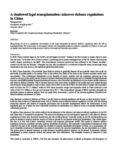 Lin, W., Andrikopoulos, P. and Zhao, J. (2020) A shadowed legal transplantation takeover defence regulations in China. Journal of Business Law, 2021 (1). pp. 30-49. ISSN 0021-9460