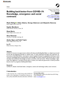 Pelling, M. ORCID: https://orcid.org/0000-0002-6472-9875, Adams, H. ORCID: https://orcid.org/0000-0003-1732-9833, Adamson, G. ORCID: https://orcid.org/0000-0001-6660-696X, Barcena, A., Blackburn, S. ORCID: https://orcid.org/0000-0003-1959-5465, Borie, M., Donovan, A. ORCID: https://orcid.org/0000-0003-3596-5294, Ogra, A., Taylor, F. and Yi, L. (2022) Building back better from COVID-19: knowledge, emergence and social contracts. Progress in Human Geography, 46 (1). pp. 121-138. ISSN 1477-0288 doi: 10.1177/03091325211059569