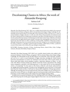 Goff, B. ORCID: https://orcid.org/0000-0003-0598-2843 (2022) Decolonizing Classics in Africa: the work of Alexander Kwapong. Bulletin of the Institute of Classical Studies, 65 (1). pp. 32-41. ISSN 2041-5370 doi: 10.1093/bics/qbac006