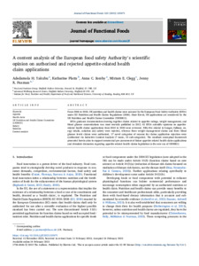 Yakubu, A. H., Platts, K., Sorsby, A. C., Clegg, M. E. and Paxman, J. R. (2023) A content analysis of the European Food Safety Authority’s scientific opinion on authorised and rejected appetite-related health claim applications. Journal of Functional Foods, 102. 105471. ISSN 1756-4646 doi: 10.1016/j.jff.2023.105471