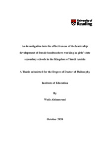 Alshamrani, W. (2020) An investigation into the effectiveness of the leadership development of female headteachers working in girls’ state secondary schools in the Kingdom of Saudi Arabia. PhD thesis, University of Reading. doi: 10.48683/1926.00110815