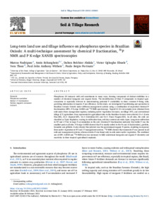 Long-term land use and tillage influence on phosphorus species in Brazilian Oxisols: a multi-technique assessment by chemical P fractionation, 31P NMR and P K-edge XANES spectroscopies.