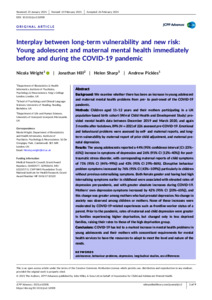 Wright, N., Hill, J., Sharp, H. and Pickles, A. (2021) Interplay between long-term vulnerability and new risk: young adolescent and maternal mental health immediately before and during the COVID-19 pandemic. JCPP Advances, 1 (1). e12008. ISSN 2692-9384 doi: 10.1111/jcv2.12008