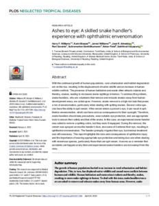 Williams, H. F., Moejes, K., Williams, J., Almeida, J. R. ORCID: https://orcid.org/0000-0002-4637-4468, Savania, R., Senthilkumaran, S., Patel, K. and Vaiyapuri, S. ORCID: https://orcid.org/0000-0002-6006-6517 (2023) Ashes to eye: a skilled snake handler’s experience with ophthalmic envenomation. PLoS Neglected Tropical Diseases, 17 (4). e0011264. ISSN 1935-2735 doi: 10.1371/journal.pntd.0011264