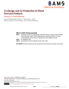 Matthews, G., Cloke, H. ORCID: https://orcid.org/0000-0002-1472-868X, Dance, S. L. ORCID: https://orcid.org/0000-0003-1690-3338, Hansford, E., Mazzetti, C. and Prudhomme, C. (2023) Co-design and co-production of flood forecast products: summary of a hybrid workshop. Bulletin of the American Meteorological Society, 104 (5). E1058-E1066. ISSN 1520-0477 doi: 10.1175/BAMS-D-23-0061.1