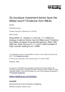 Alexandridis, G., Antypas, N. ORCID: https://orcid.org/0000-0001-8046-4590 and Lee, V. Y. (2024) Do boutique investment banks have the midas touch? Evidence from M&As. European Financial Management, 30 (1). pp. 634-672. ISSN 1468-036X doi: 10.1111/eufm.12425