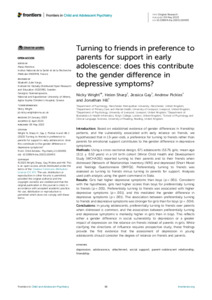 Wright, N., Sharp, H., Gay, J., Pickles, A. and Hill, J. (2023) Turning to friends in preference to parents for support in early adolescence: does this contribute to the gender difference in depressive symptoms? Frontiers in Child and Adolescent Psychiatry, 2. ISSN 2813-4540 doi: 10.3389/frcha.2023.1150493